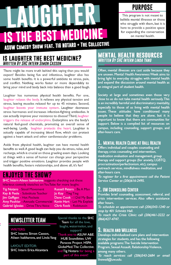 This event was FREE for all students and staff. It’s a comedy night for a good cause, encouraging people to open up about mental health awareness and laugh away the stress and worries that all college students experience. The UW’s very own improv group the Collective opened and there were giveaways, door prizes, and more!